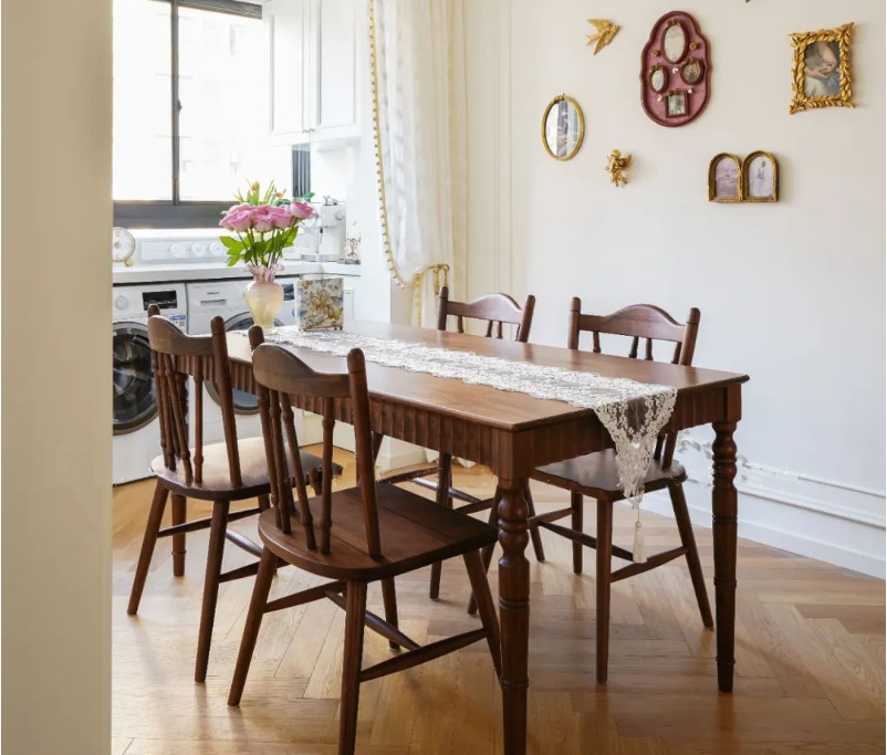 本案业主是一位美术老师,喜欢法式复古风,她梦想中的家是慵懒且治愈的。因为日常一人居,原始结构已经满足居住需求,希望客厅区域可以集观影、聚会、工作于一体,让家更好地服务于日常生活。原户型结构方正,南北通透,采光通风良好,动静分区合理。为提升居家舒适度,结合业主日常生活需求,我们进行了如下设计,生活阳台打通并入室内,增大操作空间,提升采光通风。米色玄关柜一柜到顶,回型造型柜门搭配金属拉手,细节处彰显精致优雅。